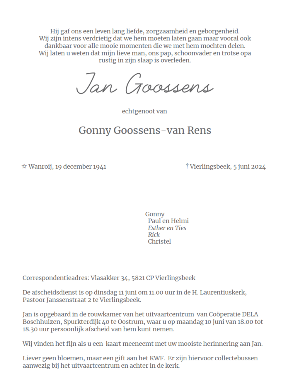 Overlijden Jan Goossens