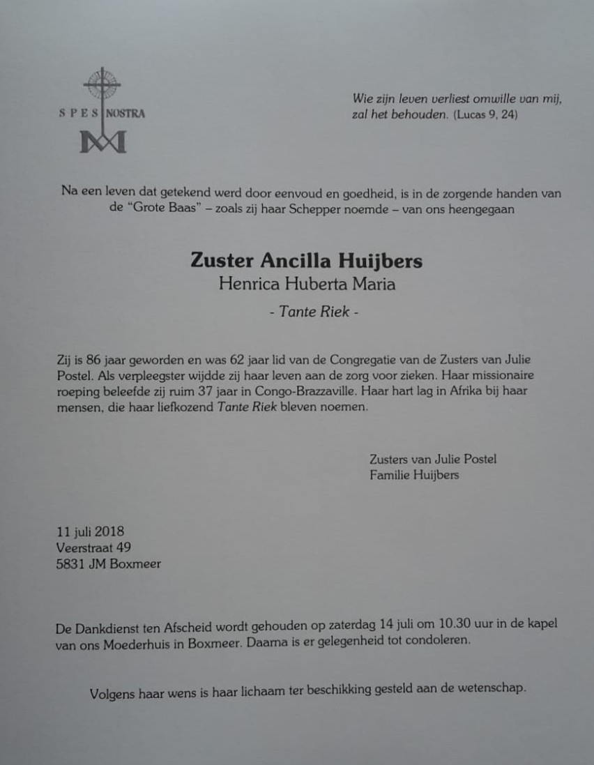 Overlijdensbericht Zuster Ancilla Huijbers - Tante Riek